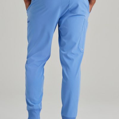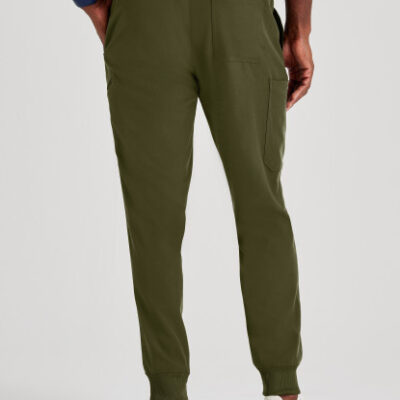 Men's pants, tapered bottom, elastic waistband with drawstring + zipper, 6 pockets.