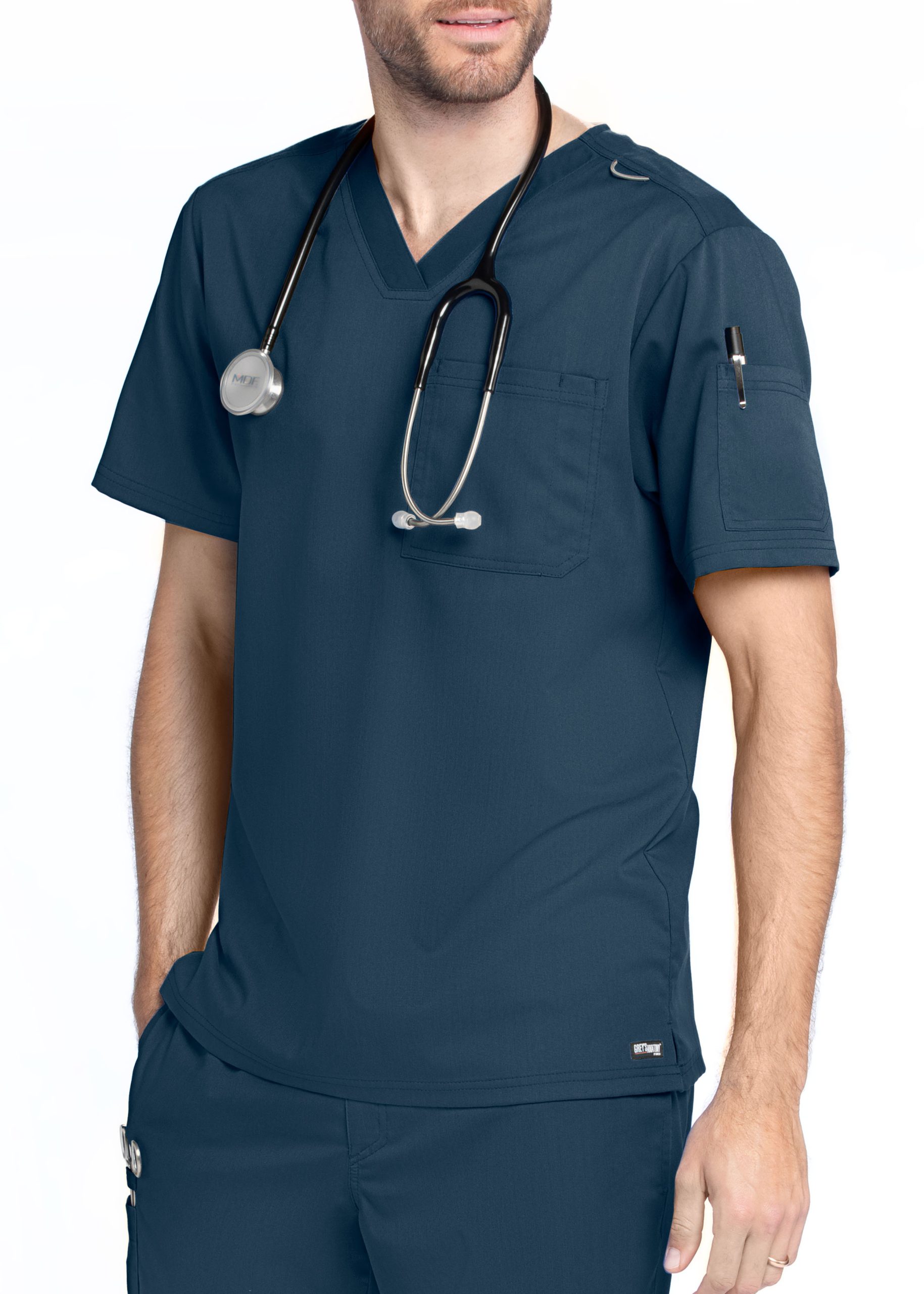 Women's blouse, 3-pocket, diamond V-neck with pen slots and high-low notched hem with orange accent trim detail. Modern Fit.