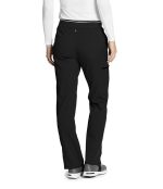 Women's pant, 5-pocket, flat front with silicone draw-cord, elastic back, mid-rise, double-pocket single cargo, lapped vent with orange bartack accent detail at hem.