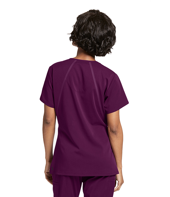 Women's blouse, 3-pocket, diamond V-neck with pen slots and high-low notched hem with orange accent trim detail. Modern Fit.