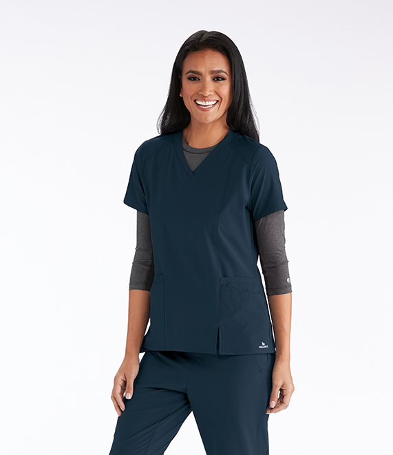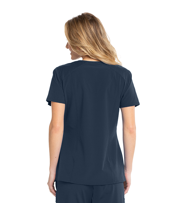 Women's blouse, 3-pocket, diamond V-neck with pen slots and high-low notched hem with orange accent trim detail. Modern Fit.
