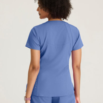 Women's blouse, 3-pocket, diamond V-neck with pen slots and high-low notched hem with orange accent trim detail. Modern Fit.