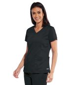 Women's blouse, 3-pocket, diamond V-neck with pen slots and high-low notched hem with orange accent trim detail. Modern Fit.