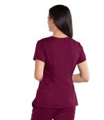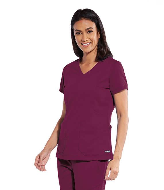 Women's blouse, 3-pocket, diamond V-neck with pen slots and high-low notched hem with orange accent trim detail. Modern Fit.