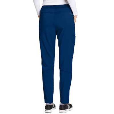 Women's pant, 5-pocket, flat front with silicone draw-cord, elastic back, mid-rise, double-pocket single cargo, lapped vent with orange bartack accent detail at hem.