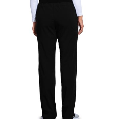 Women's pant, 5-pocket, flat front with silicone draw-cord, elastic back, mid-rise, double-pocket single cargo, lapped vent with orange bartack accent detail at hem.