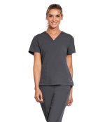 Women's blouse, 3-pocket, V-neck princess seam front and back with rib knit back and shaped notched hem. Modern Fit.