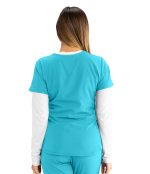 Women’s blouse V-neck, 3-pocket, virtual V-neck, shaped hem, detailed cover stitching, contrast back neck binding.