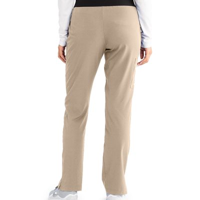 Women's pant, 5-pocket, flat front with silicone draw-cord, elastic back, mid-rise, double-pocket single cargo, lapped vent with orange bartack accent detail at hem.