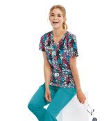 Women's blouse, 3-pocket, V-neck princess seam front and back with rib knit back and shaped notched hem. Modern Fit.
