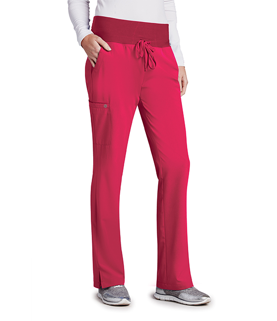 Women's pant, 5-pocket, flat front with silicone draw-cord, elastic back, mid-rise, double-pocket single cargo, lapped vent with orange bartack accent detail at hem.