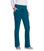 Women's pant, 5-pocket, flat front with silicone draw-cord, elastic back, mid-rise, double-pocket single cargo, lapped vent with orange bartack accent detail at hem.