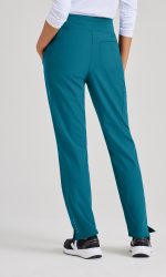 Women's pant, 5-pocket, flat front with silicone draw-cord, elastic back, mid-rise, double-pocket single cargo, lapped vent with orange bartack accent detail at hem.