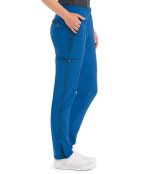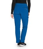 Women's pant, 5-pocket, flat front with silicone draw-cord, elastic back, mid-rise, double-pocket single cargo, lapped vent with orange bartack accent detail at hem.
