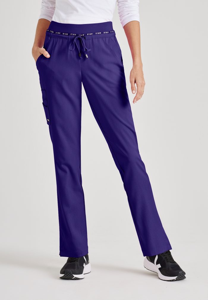 Women's pant, 5-pocket, flat front with silicone draw-cord, elastic back, mid-rise, double-pocket single cargo, lapped vent with orange bartack accent detail at hem.