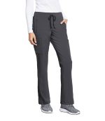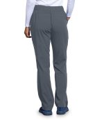 Women's pant, 5-pocket, flat front with silicone draw-cord, elastic back, mid-rise, double-pocket single cargo, lapped vent with orange bartack accent detail at hem.