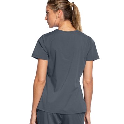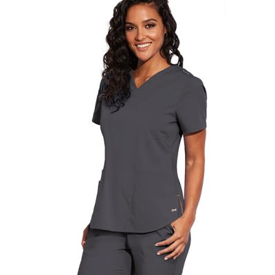 Women's blouse, 3-pocket, V-neck princess seam front and back with rib knit back and shaped notched hem. Modern Fit.