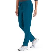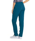 Moteriškos siaurėjančios kelnės elastine guma ties juosmeniu, užrišamos priekyje.