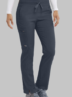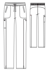 Moteriškos siaurėjančios kelnės elastine guma ties juosmeniu, užrišamos priekyje.