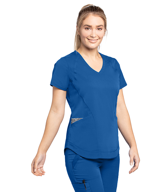 Женская блузка с V-образным вырезом и 3 карманами.